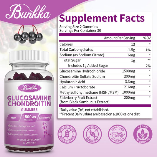 Bunkka 2 Pack Glucosamine Chondroitin Gummies Extra Strength w/MSM,Elderberry,Hyaluronic Acid-Chewable Joint Support Supplement for Women,Men,Adults-Antioxidant Support for Joint Comfort & Mobility