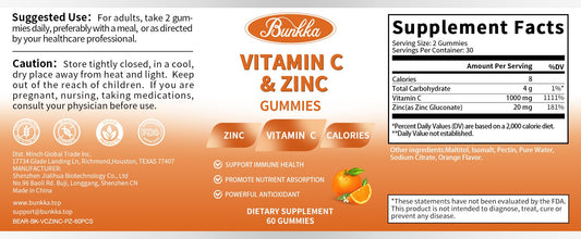 BUNKKA Vitamin C 1000Mg With Zinc Gummies For Cellular Energy Production and Collagen Synthesis Immune Health Promote Metabolism Antioxidant