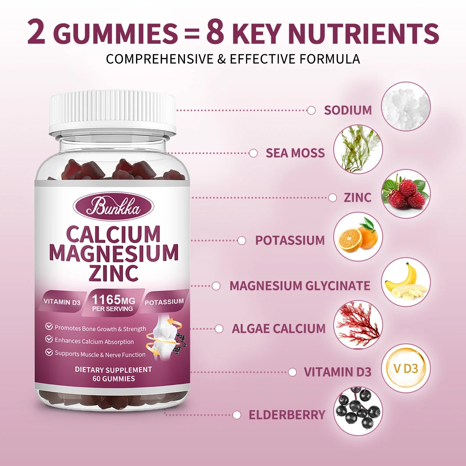 - Calcium Magnesium Zinc Gummies Contain 500mg Calcium, 200mg Magnesium , 10mg Zinc, 25mcg Vitamin D3, Potassium, Sodium,OrganicSea Moss,Elderberry Extract